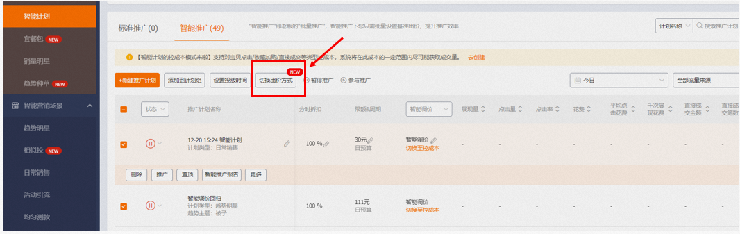 在智能计划的计划列表中,可自行切换智能调价模式的计划。