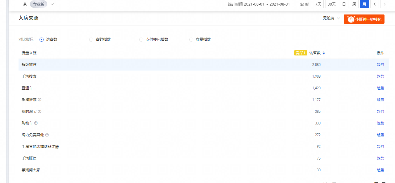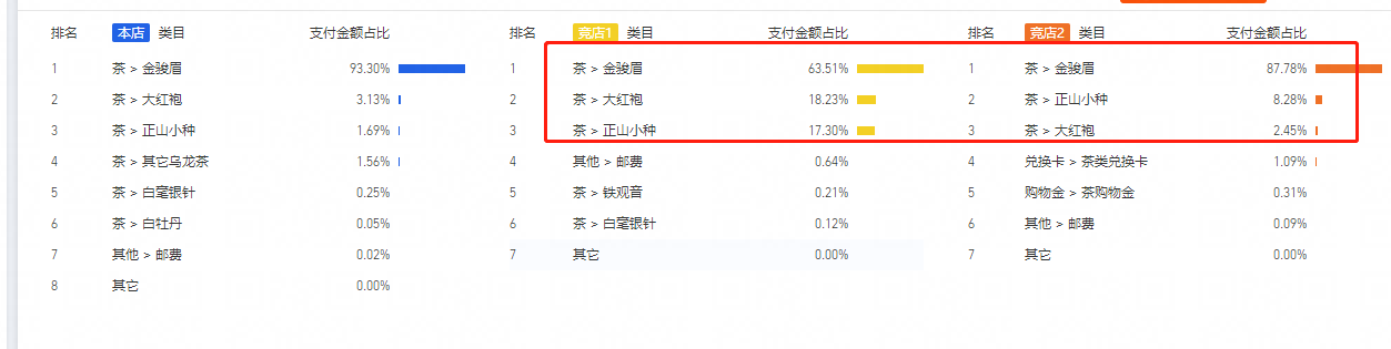 这里重点可参考竞店类目占比。正山小种、大红袍类的产品线拓展,并做以下初步分析